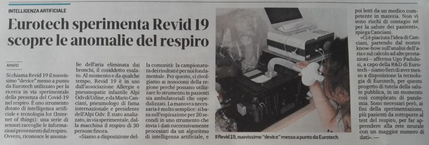 Da alcuni anni ALPI sta collaborando con Eurotech per la realizzazione di alcuni progetti sull’inquinamento atmosferico e da 6 mesi sul riconoscimento del Coronavirus nel respiro. Si tratta di una metodica nuova, sembra unica al mondo, basata sul principio delle reti neurali: in pratica il computer si “autoistruisce” a riconoscere delle alterazioni nel respiro che poi vengono collegate allo stato clinico del paziente e confrontato con tamponi e test sierologici. Il test dura una ventina di secondi e si basa sulla semplice respirazione in un apparecchio. Se il metodo si rivelerà efficace, si potranno eseguire una cinquantina di test all’ora per singolo apparecchio, con risposta immediata e senza bisogno di eseguire test fastidiosi e costosi.
